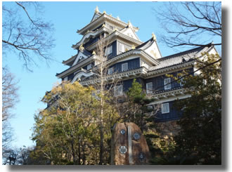 岡山駅前の目抜き通りを直進すると、岡山城です。黒漆塗の外観が目を引きます。
