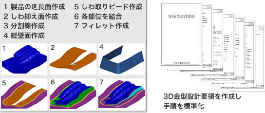そこで、これらノウハウをまとめた「3D金型設計要領」を作成し、すべての設計者が同じプロセスで設計できるよう勉強会(月一回)を行いました。