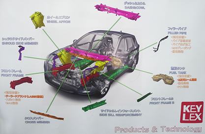 高ハイテン材や、各種のメッキ材料に対応したハイレベルの塑性加工技術・溶接技術を有し、特にボディシェルなど高品質な自動車の大物プレス部品を得意としています。