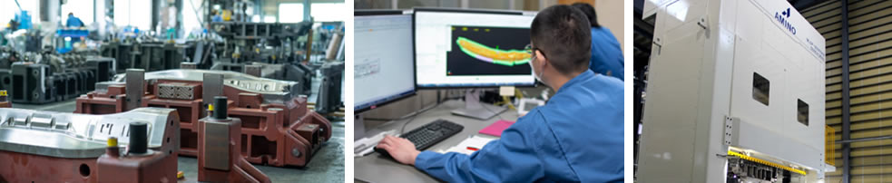 特に、自動車軽量化により普及が進むアルミ素材部品(5000系・6000系)と超ハイテン材(980MPa〜)の金型製作実績に定評がある。