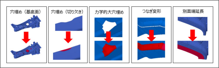 「モデリング・見込み変形支援(FORM-EX)」ではダイフェースモデリング専用機能が効果を発揮した。上流工程からの授受データに穴がある場合、すべての穴を埋める必要がある。200個以上の穴を、以前は一つ一つ確認しながら穴埋め作業をしていたが、専用機能の穴埋めコマンドを使えば一括で自動穴埋めができる。