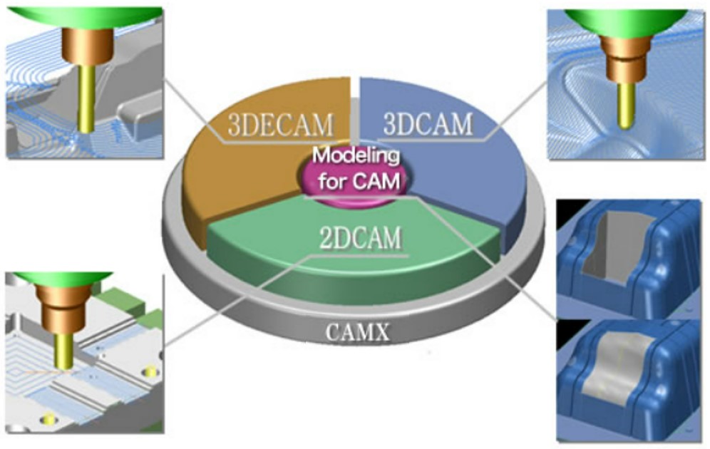 CAMX supports the machining modes: 2DCAM (hybrid 2D CAM), 3DCAM (hybrid 3D CAM) and 3DECAM (GP-CAM). Thus, it can create paths that fit various types of machining such as holing in an assimilated environment of 2D and 3D machining. Furthermore, the modelling capability of streamlining CAM operations as well as the capabilities of editing and analyzing surfaces improve the machining efficiency and the quality of paths.