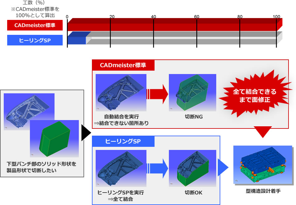 3Dモデルを指示するだけで重複面や面離れ、面抜けを自動検索し、修正、結合まで行います。