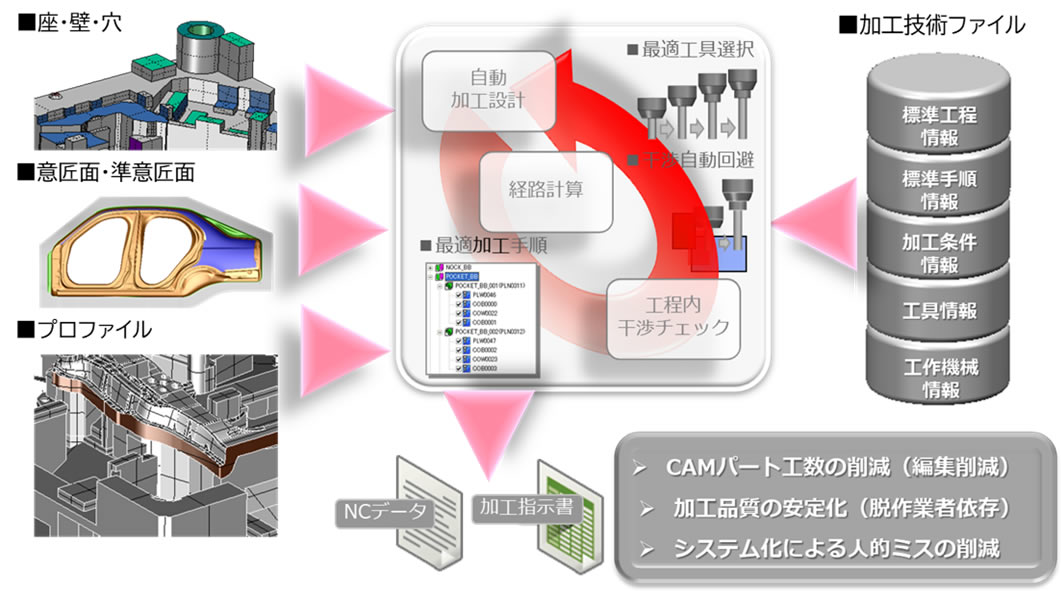 Full Auto CAMでは、「作業者スキルに依存しない高品質な加工データを短時間で作成する」をコンセプトとして、工程設計〜NC生成までの各種CAM作業を効率化する機能群を提供しています。