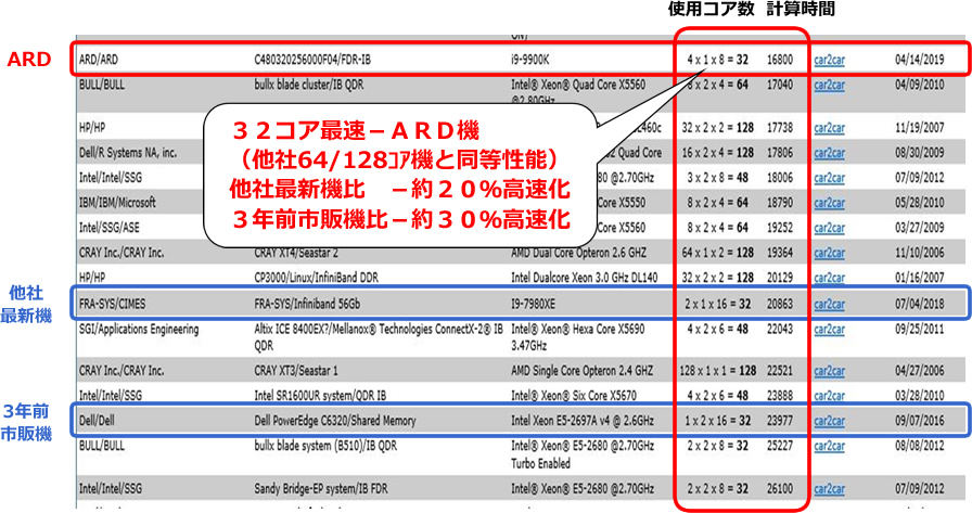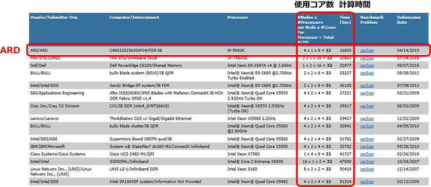 米連邦政府DARPAがサポートし、カリフォルニア大学(UCSD)が運営しているベンチマークサイトTopCrunchにて、ARDはLS-DYNA(構造解析)のベンチマークにおいて 2,4,8,16,32,64 コアで世界1を記録しています。