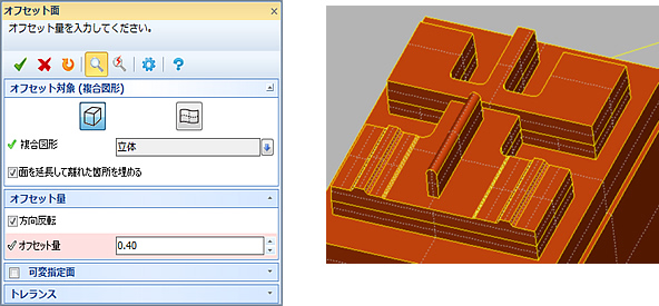 ![]() ![]() 【オフセット】 前バージョンと比較し、CADmeister V11.0では複雑な形状でもオフセットできるように改善しました。 例えば、電極の減寸モデリングをおこなう時に有効です。 ![]() |
